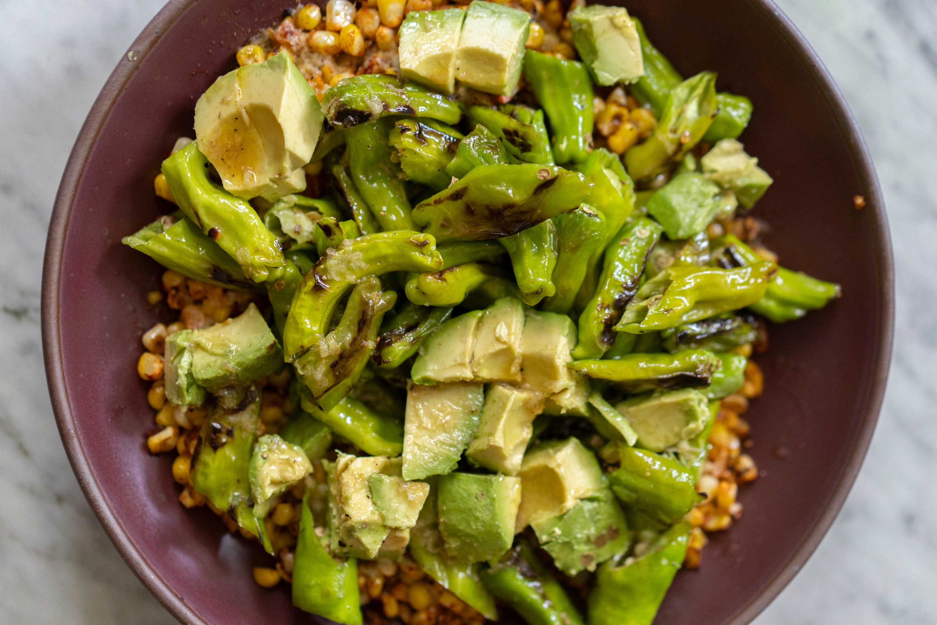 Shishitos cook quickly and are very open to enthusiastic seasoning. Here I take these affable peppers from snack to salad in a lively salad that has it all - texture, creaminess, zest.